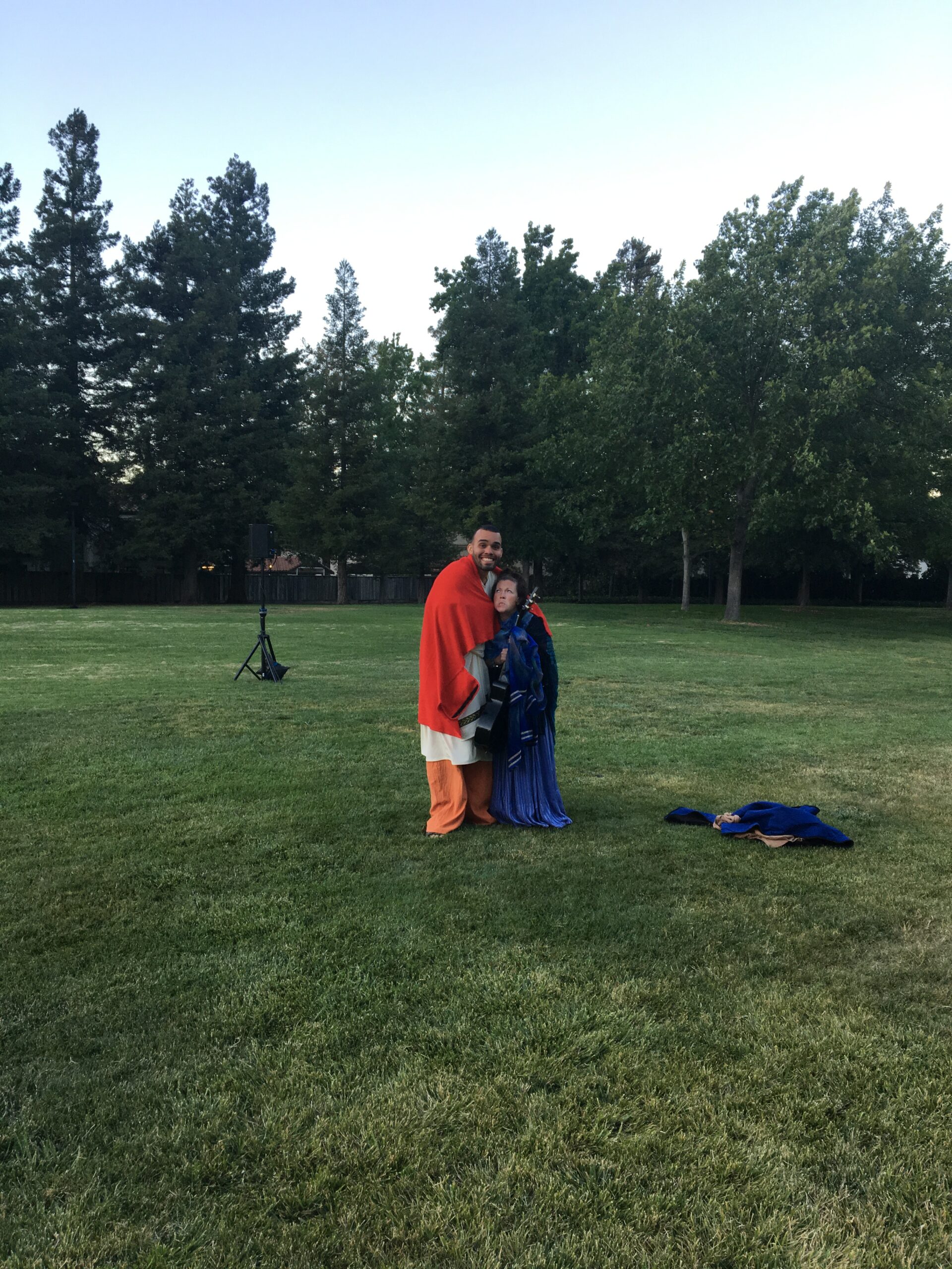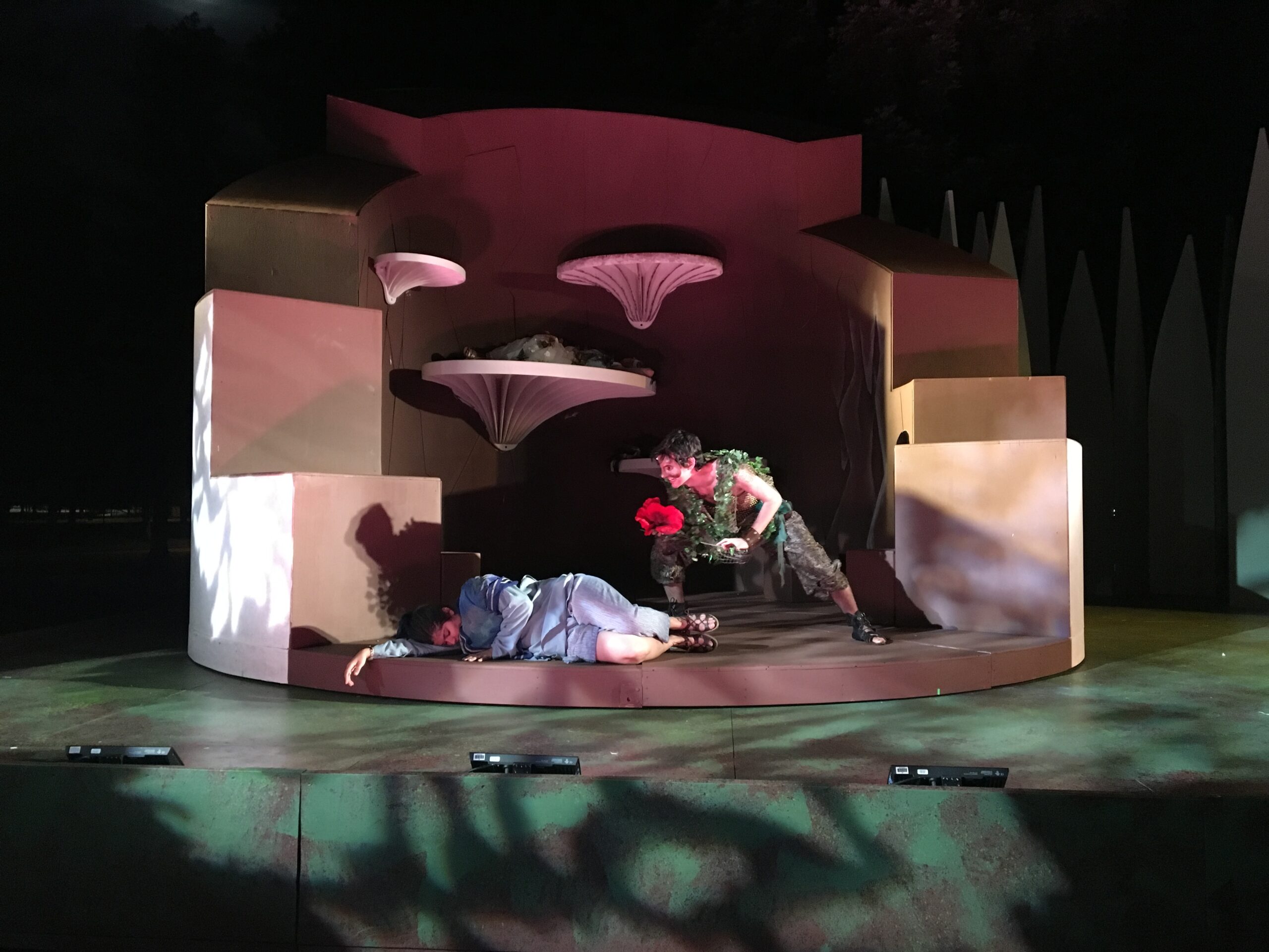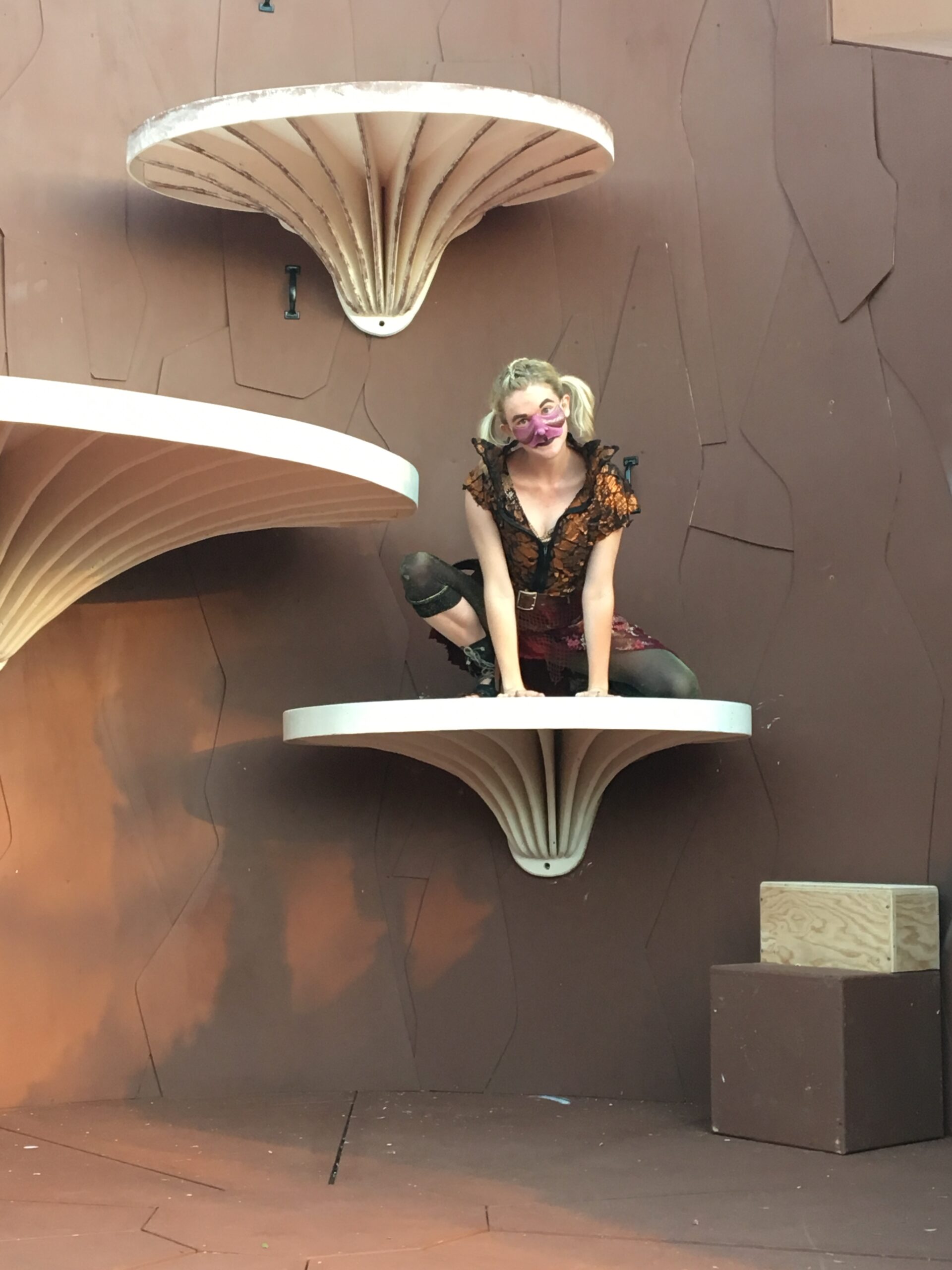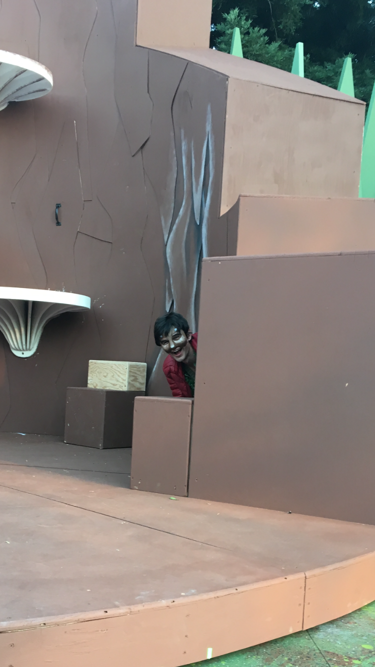 After months of planning, building, creating, and rehearsing, it’s time to put it all together. During this week, we finally head out to the park where Neal Ormond, our set designer, has assembled the stage. At the park, we’re able to add in the lighting design, work with the microphones, speakers, and recorded sound, rehearse in full costume, and finally perform on the set.